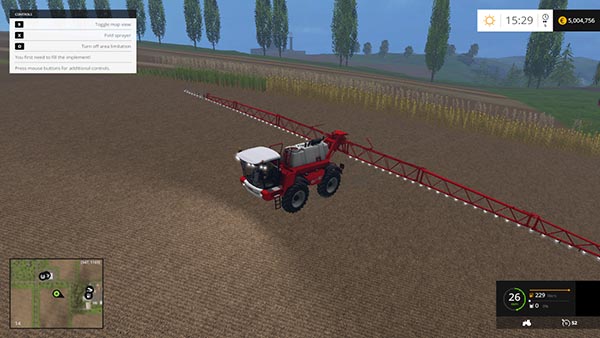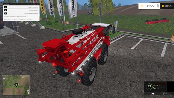 Самоходный опрыскиватель. Скорость 52 км/ч. Светотехника, рабочие зеркала, анимация рук фермера, регулировка по высоте шлангов, прицепное устройство, оставляет следы, пыль из под колес. Моющийся. Объем бака: 5000 л. Рабочая ширина: 41 м. Рабочая скорость 25 км/ч.