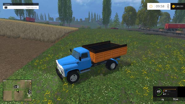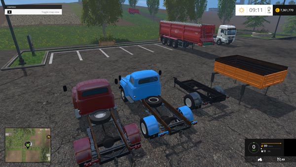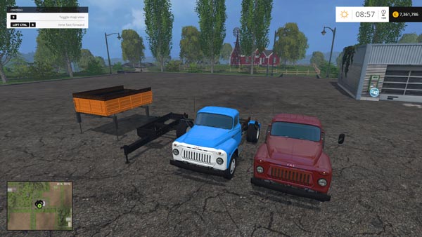 In the pack includes a GAZ-53 and GAZ-53 standard. The speed of 83 km / h. Lighting, dust from the wheels leave traces of traces, the color choice when buying (at first), washable. Cargo module to 5000 liters, transports: wheat, barley, canola, corn, sugar beets, potatoes, grass, wheat straw, barley, chaff, silage, fodder, foodmixture, wood chips, manure, wool, sand. Color choice when buying, washable. Two modules barrels, one for the transportation of gasoline ATZ-3.8 (3800 L) washable. The second for the transport of water and milk ATSPT-3,3 (3300l), washable. Sprayer “Dawn 3000-02”, volume (3000 L) washable and trailer-truck which can also cling modules color choice when buying, washable.