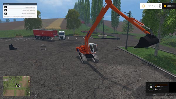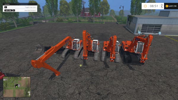 Included are three crawler excavators and one wheel (different labeling) and three bucket for them. Power 420 hp Speed 21 km / h. Lighting, open the left door, includes wipers, electronic speedometer, mirror work, leaving traces of dust from the wheels / tracks. Buckets (2500 l. And 4500 l.). ship: wheat, canola, corn, barley, chaff, potatoes, sugar beet, silage, manure, wood chips, dirt (it is written in modDesc.xml, dirt). Bucket (2500 L). ship: potatoes, sugar beets, manure.
