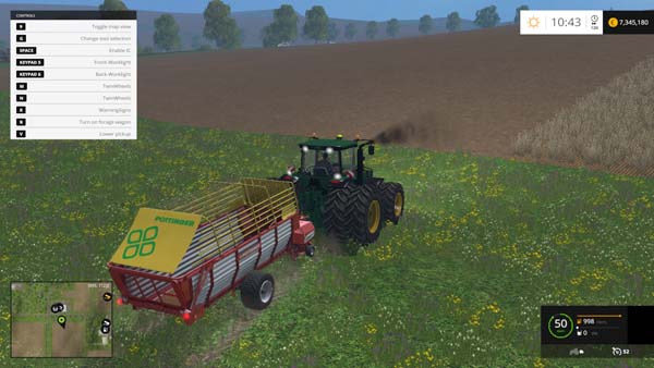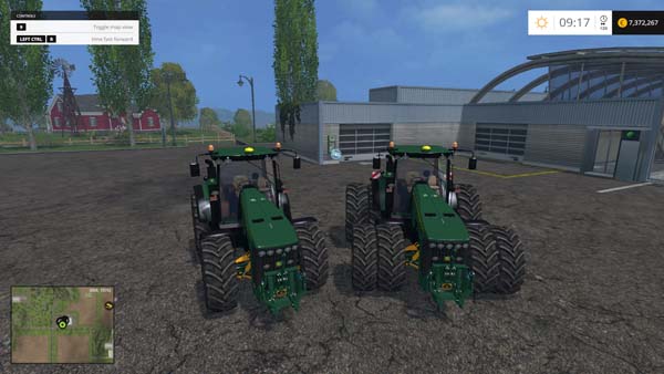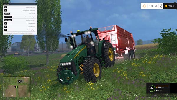 Power 650 hp Speed 49 km / h. Light engineering. Interactive control (IC) (opens the door and left rear window, expanded front linkage). Workers mirrors, electronic speedometer and tachometer, animation hands farmer plugmod, dual wheels, dust from the wheels, it leaves traces.