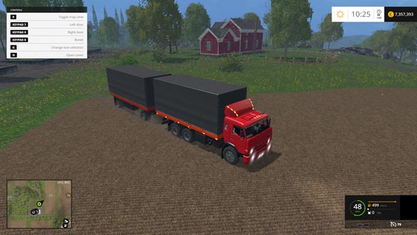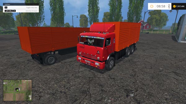 Мод “КамАЗ 53212 (Red) & Trailer GKB v2.0” для Farming Simulator 2015 – Светотехника, зеркала, открываются двери и капот, поднимается кабина, пыль из-под колес, оставляет следы на дороге. Вместимость КамАЗа – 17, прицепа – 11 тонн. Перевозят: пшеницу, ячмень, рапс, кукурузу, сахарную свеклу, картофель, траву, солому, силос, навоз, щепу.
