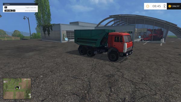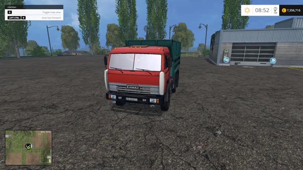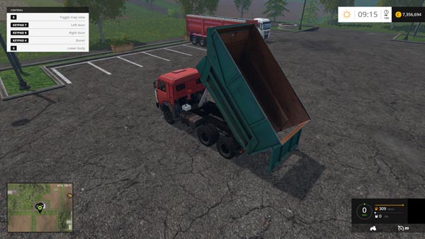 Мод “KamAZ-55111 v2.0” для Farming Simulator 2015 – 220 лс, 88 км/ч. Открываются двери и бардачок; светотехника, спидометр, тахометр, топливомер, амперметр, вода, масло, зеркала, реалистичная камера, принудительный подъём кузова, прицепное, колёсная пыль, дорожные следы. Моется. Перевозит: пшеница, ячмень, рапс, кукуруза, сахарная свекла, картофель, трава, сечка, удобрение, щепа; подсолнух, песок (15000 л).
